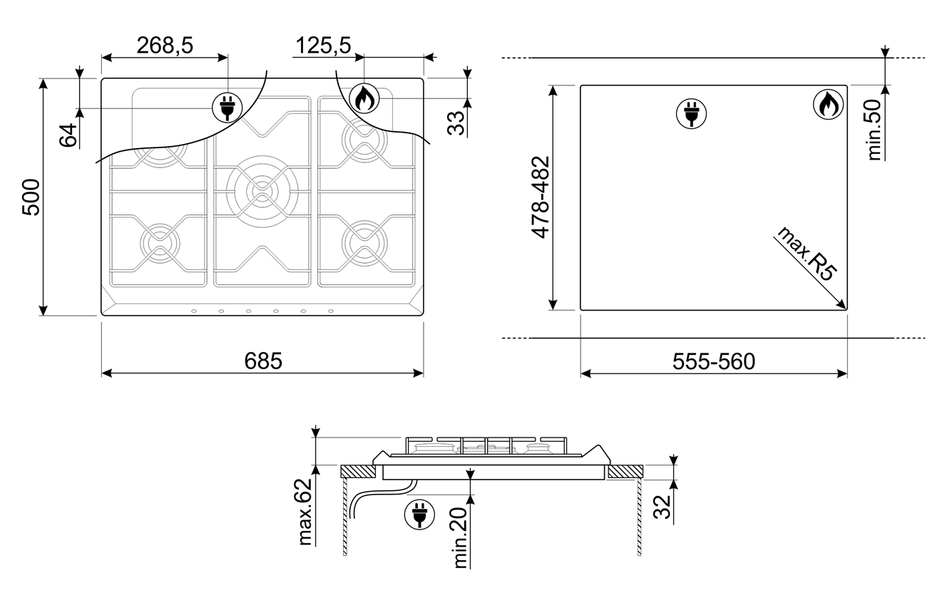 Зоны приготовления: 5 газовых горелок с автоматическим электроподжигом и газ-контролем. Левая фронтальная конфорка, вспомогательная (1,1 кВт); Левая задняя конфорка, быстрая (2,6 кВт); Центральная конфорка, ультрабыстрая (5 кВт); Правая фронтальная конфорка, полубыстрая (1,7 кВт); Правая задняя конфорка, полубыстрая (1,7 кВт).