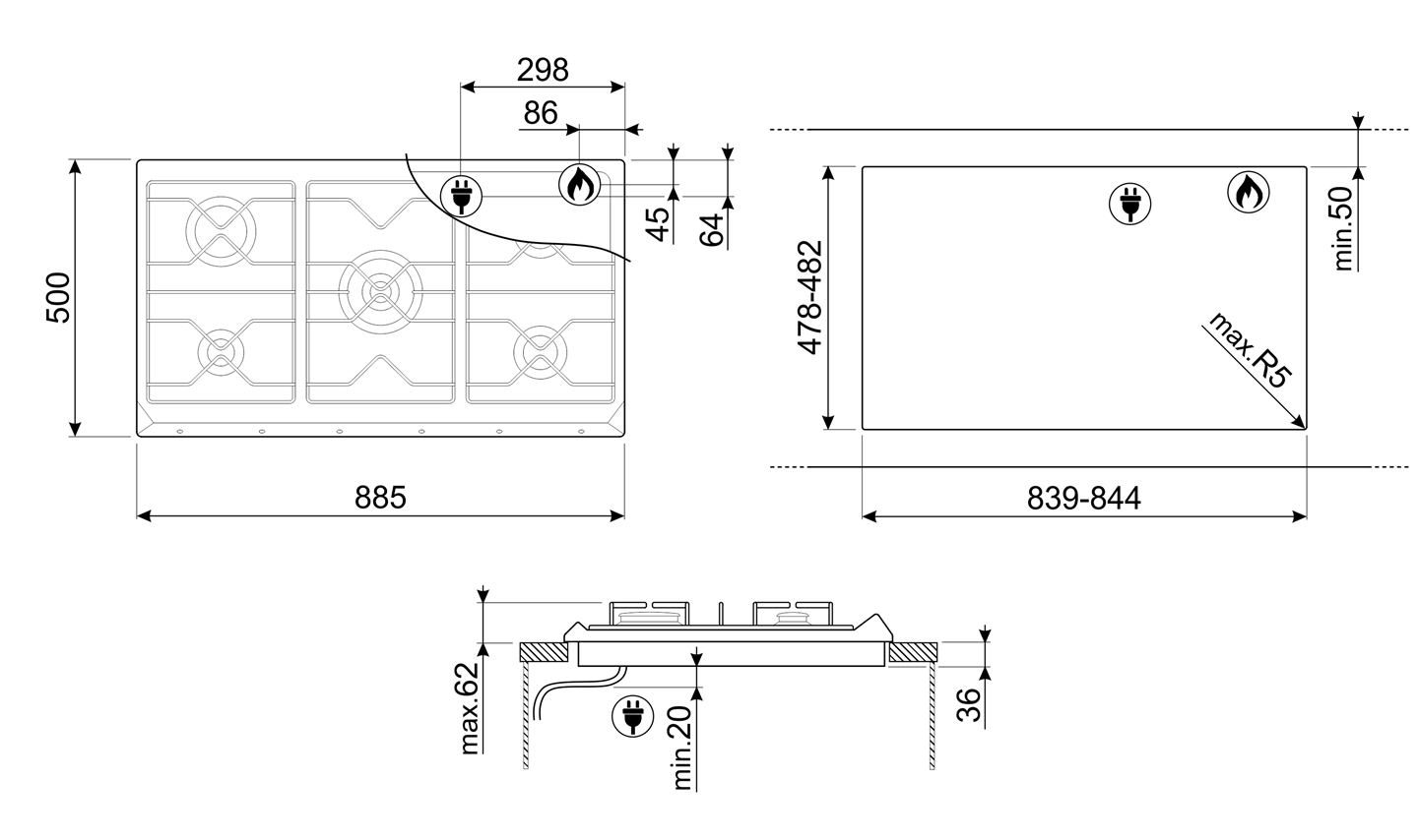 Зоны приготовления: 5 газовых горелок с автоматическим электроподжигом и газ-контролем. Левая фронтальная конфорка, вспомогательная (1,1 кВт); Левая задняя конфорка, быстрая (3,1 кВт); Центральная конфорка, ультрабыстрая/двойная (5 кВт); Правая фронтальная конфорка, полубыстрая (1,7 кВт); Правая задняя конфорка, полубыстрая (1,7 кВт).