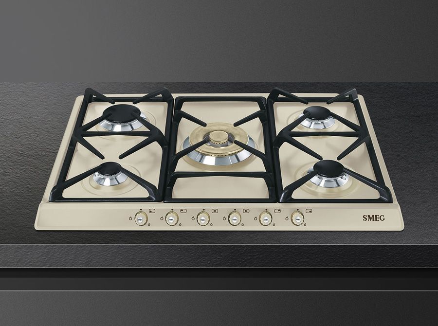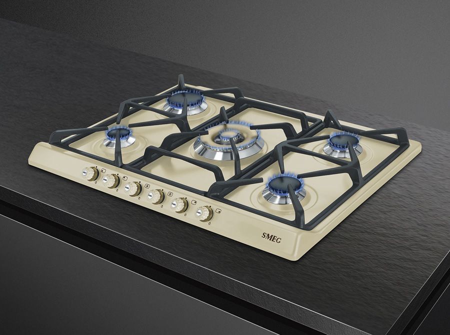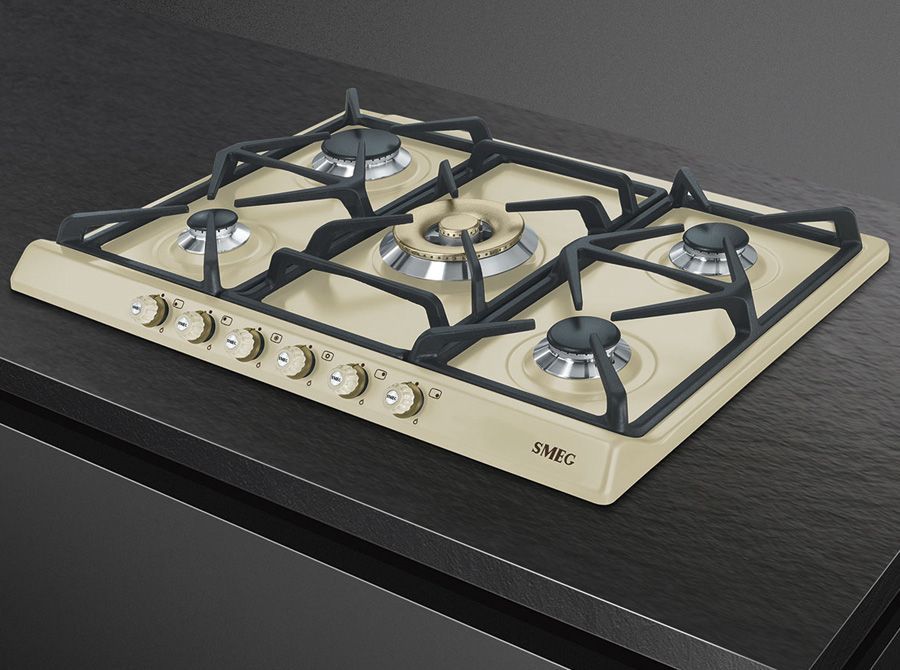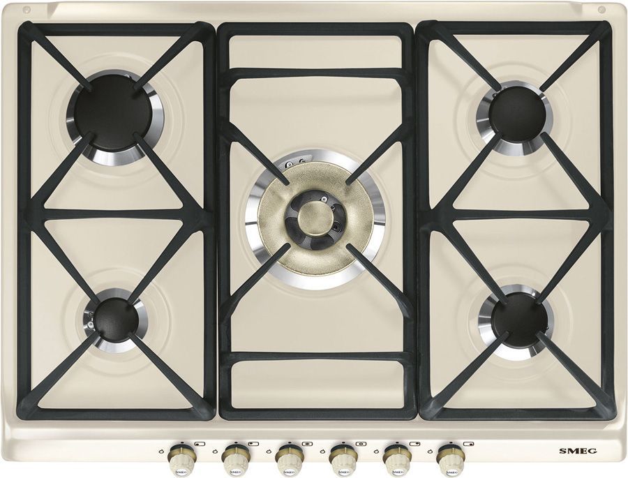 Эстетика: Цвет: кремовый; Эстетика: Cortina; Фурнитура: латунная; Материал корпуса: эмалированный; 6 фронтальных поворотных переключателей; Цвет переключателей: кремовый; Решетки: чугунные; Горелки: Smeg Contemporanea; Материал горелок: алюминий; Цвет сериографии: серый.