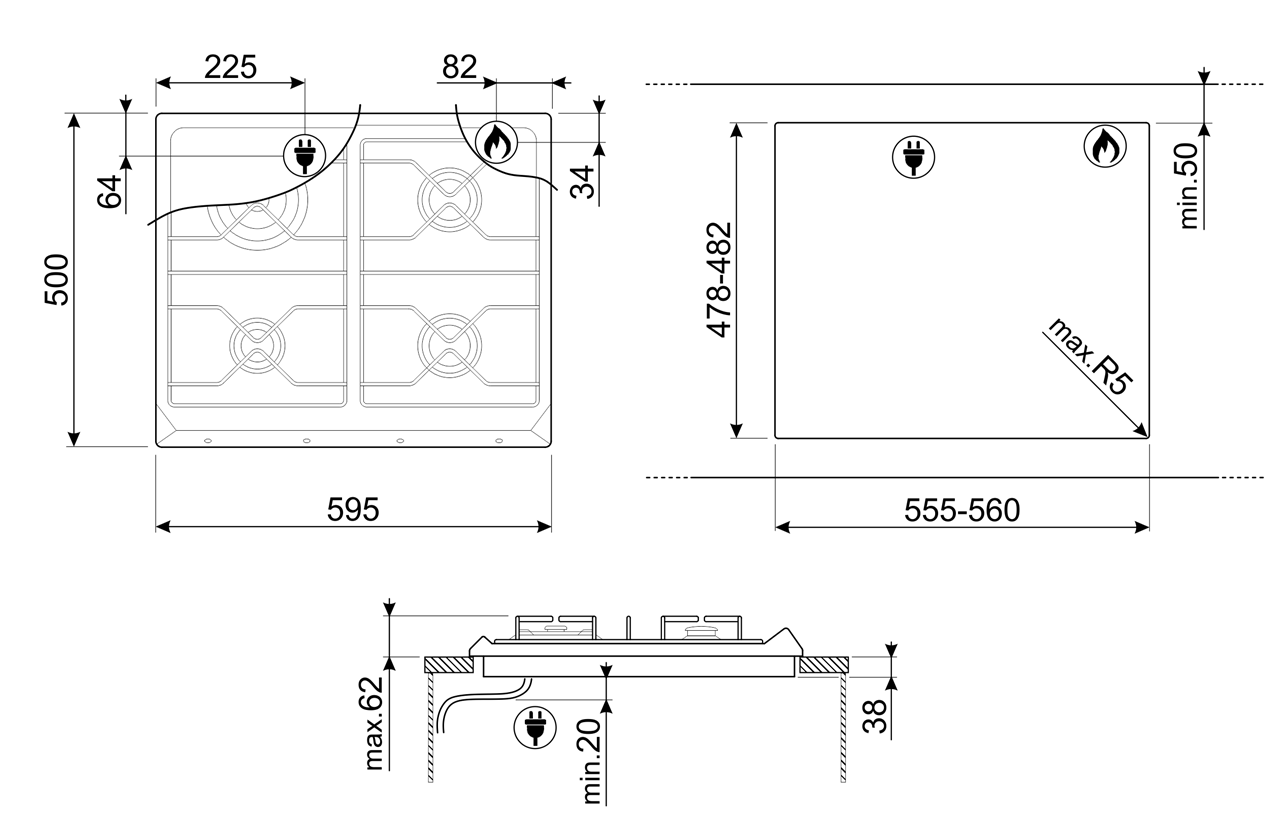 Зоны приготовления: 4 газовых горелки с автоматическим электроподжигом и газ-контролем. Левая фронтальная конфорка, вспомогательная (1,1 кВт), Левая задняя конфорка, ультрабыстрая (3,3 кВт), Правая фронтальная конфорка, полубыстрая (1,7 кВт), Правая задняя конфорка, полубыстрая (1,7 кВт).