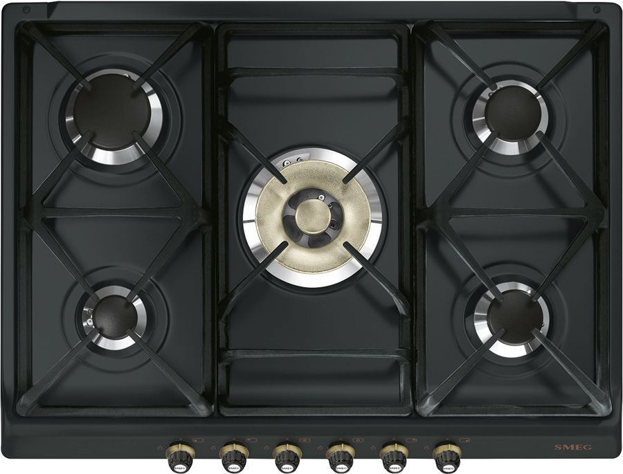 Эстетика: Цвет: антрацит; Эстетика: Cortina; Фурнитура: латунная; Материал корпуса: эмалированный; 6 фронтальных поворотных переключателей; Цвет переключателей: чёрный; Решетки: чугунные; Горелки: Smeg Contemporanea; Материал горелок: алюминий; Цвет сериографии: серый.